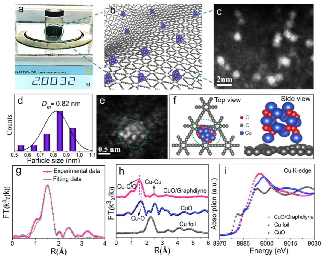 有鉴于此,华中师范大学郭彦炳等报道通过石墨炔中的sp杂化C≡C三重键作为供电子体,发展了一种高催化活性的稳定催化剂用于活化O2分子。发现亚纳米簇CuO/石墨炔基底中的Cu原子与通过桥吸附形式吸附的sp杂化C原子通过相邻,是关键的活化O2分子位点。