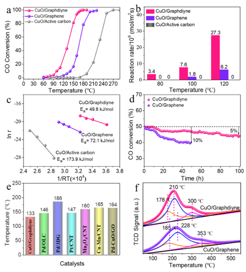 要点1. 合成的亚纳米簇CuO/石墨炔催化剂在133 ℃展示了最好的CO氧化反应性能,实现了50 %的CO转化率,比CuO/石墨烯催化剂、CuO/活性炭催化剂的最好催化温度分别低34 ℃、94 ℃。
