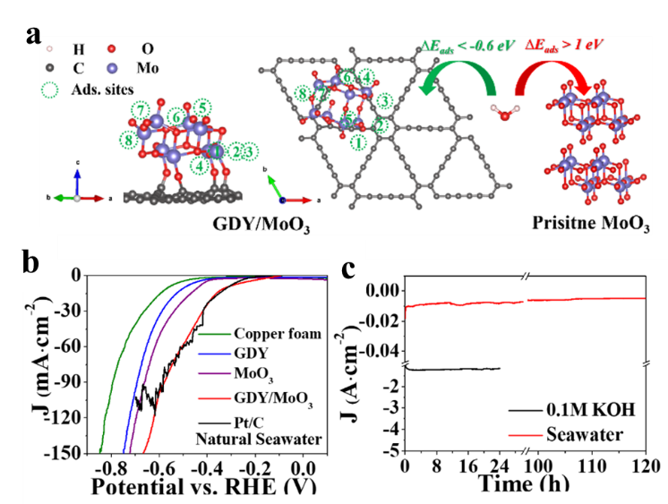图3. (a) H2O分子在GDY/MoO3-Vo和纯MoO3上吸附位置示意图;(b) 样品在0.1M KOH溶液中的极化曲线;(c) GDY / MoO3在0.1 M KOH和天然海水中的时间-电流曲线