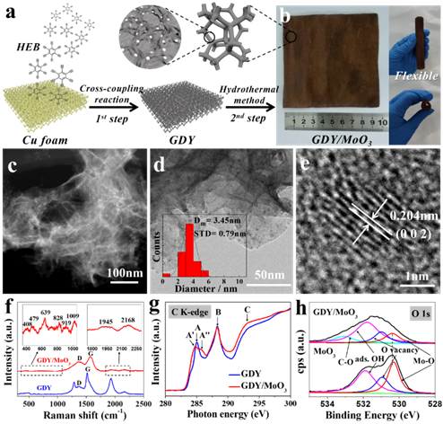 近日,该课题组通过精准界面调控制备出具有界面“sp杂化C-O-Mo键”的三维自支撑石墨炔/氧化钼(GDY/MoO3)复合材料,并实现了在大电流密度析氢领域的应用。该工作首先通过DFT理论计算预测只有GDY与氧化钼MoO3之间才能以“sp杂化C-O-Mo键”的形式形成化学键(石墨烯不能与MoO3形成化学键),且该化学键的形成有助于石墨炔/氧化钼(GDY/MoO3)吸附更多的水分子(图1)。然后通过原位生长法,在三维自支撑基底泡沫铜上成功制备了具有sp杂化C-O-Mo键的GDY/MoO3电催化剂,通过拉曼(Raman)、X射线光电子能谱(XPS)和X射线近边吸收光谱(XANES)对GDY/MoO3进行结构形貌表征(图2),结果表明MoO3以平均粒径3.45 nm的纳米颗粒负载在GDY表面,且GDY中sp杂化形式的C原子与MoO3形成了化学键(C-O-Mo键),与DFT计算结果一致。