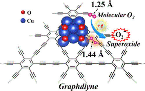 Activation of O2is a crucial step in oxidation processes. Here, the conceptof sp-hybridized C & xe0c9;C triple bonds as an electron donor is adopted to develop highlyactive and stable catalysts for molecular oxygen activation. We demonstrate that theneighboring sp-hybridized C and Cu sites on the interface of the sub-nanocluster CuO/graphdiyne are the key structures to effectively modulate the O2activation process in thebridging adsorption mode. The as-prepared sub-nanocluster CuO/graphdiyne catalystexhibited the highest CO oxidation activity and readily converted 50% CO at around 133 degrees C, which is 34 and 94 degrees C lower than that for CuO/graphene and CuO/active carboncatalysts, respectively. In situ diffused reflectance infrared Fourier transform spectroscopyand density functional theory calculation results proved that the neighboring sp-hybridizedC is more favorable to promote the rapid dissociation of carbonate than sp2-hybridized C without overcoming any energy barrier.The gaseous CO directly reacts with the active molecular oxygen and tends to proceed through the E-R mechanism with a relativelylow energy barrier (0.20 eV). This work revealed that sp-hybridized C of graphdiyne-based materials could effectively improve theO2activation efficiency, which could facilitate the low-temperature oxidation processes.