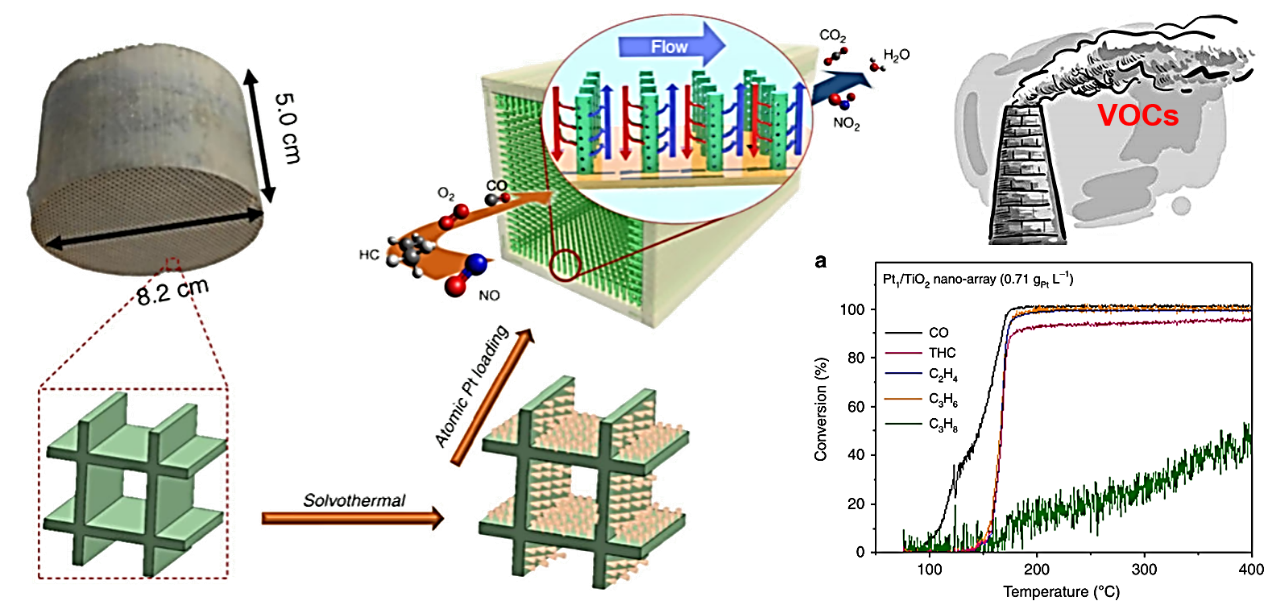 机动车尾气排放、化石燃料燃烧等产生的可挥发性有机污染物形成对流层臭氧、二次有机气溶胶和光化学烟雾的主要前驱体,对动植物健康和生态平衡造成极大的威胁。我们致力于开发新型高效催化剂,主要集中在贵金属Pt基催化剂、过渡金属Cu基催化剂以及钙钛矿型催化剂。深入探究催化活性位点和催化机制,揭示催化剂的构效关系,为高效VOCs催化氧化设备的产业化开发提供明确的指导。